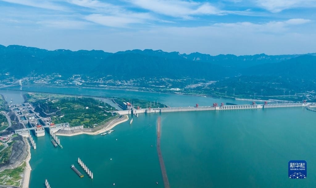 6月10日,船舶有序通過三峽雙線五級船閘(無人機(jī)照片)。