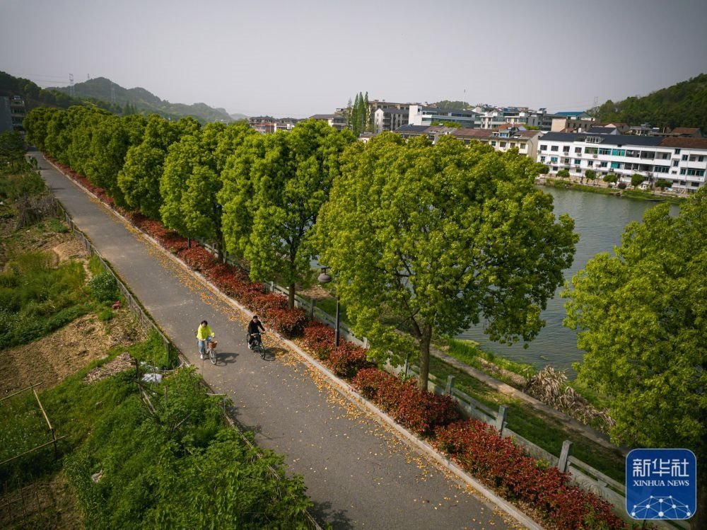 村民在浙江諸暨市暨南街道街亭村開化江畔的綠道上騎行(4月12日攝,無人機(jī)照片)。新華社記者 江漢 攝