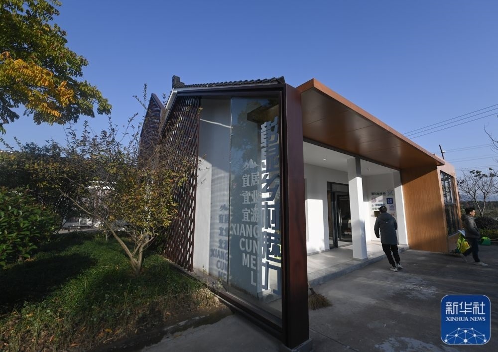 這是浙江杭州市桐廬縣桐君街道梅蓉村金黃的稻田與鄉(xiāng)村會(huì)客廳(2022年10月25日攝)。新華社記者 江漢 攝