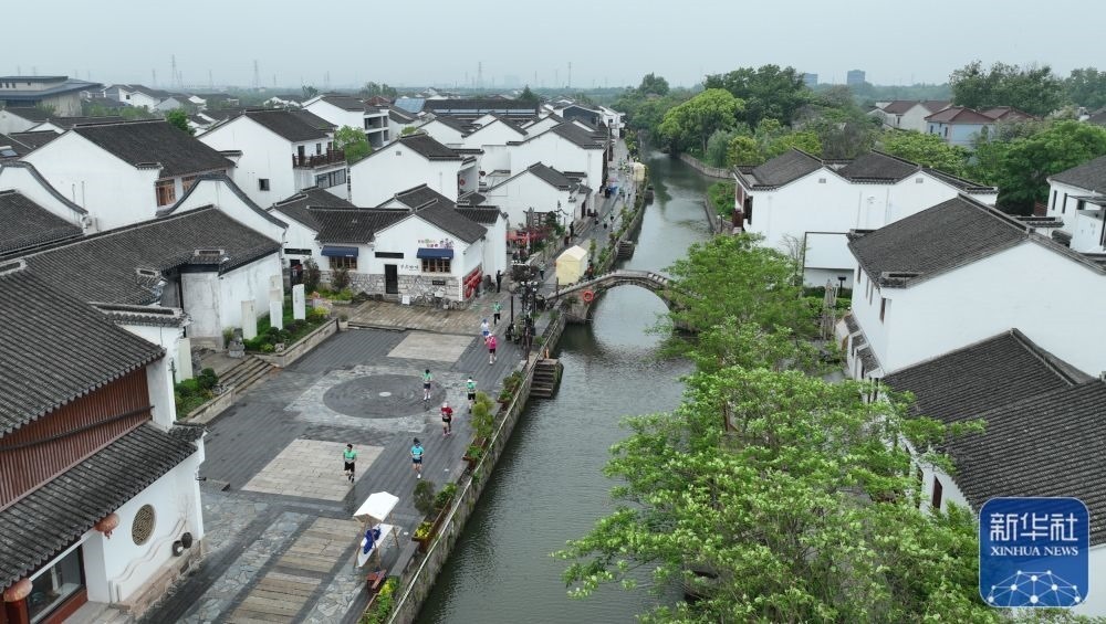在浙江湖州市八里店鎮(zhèn)潞村,人們?cè)趨⒓右粓?chǎng)鄉(xiāng)村馬拉松比賽(4月29日攝)。新華社記者 翁忻旸 攝