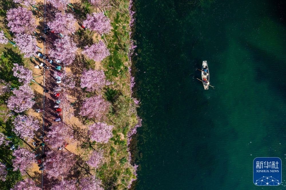在浙江金華市浦江縣浦陽江同樂段,工作人員乘船在打撈水面漂浮物(3月14日攝,無人機(jī)照片)。當(dāng)?shù)赝ㄟ^生態(tài)治理、河湖清淤、景觀改造、種植水生植物等綜合整治措施,造就浦陽江畔春有櫻花落英、秋有杉葉火紅的四季美景,滿足群眾賞景及親水需求。浦陽江也成功創(chuàng)建為“浙江省美麗河湖”。新華社記者 徐昱 攝