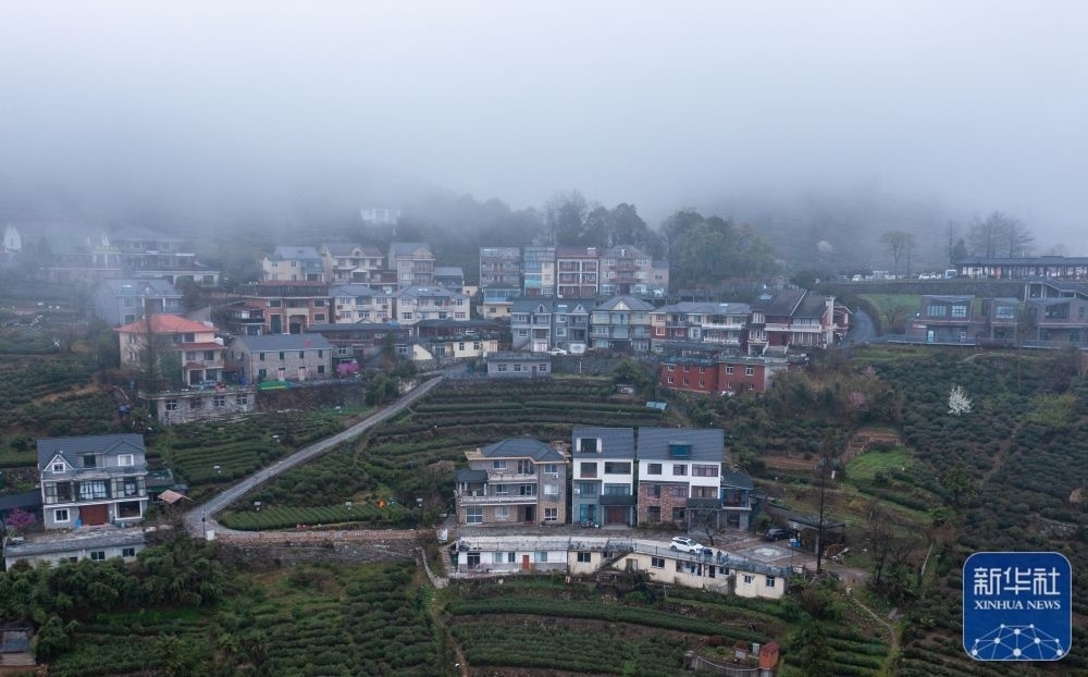 空中俯瞰云霧中的浙江杭州富陽里山鎮(zhèn)安頂村(3月23日攝,無人機(jī)照片)。安頂村海拔700多米,一年中有200多天可觀賞“安頂云海”奇景,當(dāng)?shù)匕傩找劳懈呱皆旗F茶以及特色鄉(xiāng)村旅游產(chǎn)業(yè),走出了一條茶旅融合的新農(nóng)村共同富裕發(fā)展模式。新華社記者 徐昱 攝