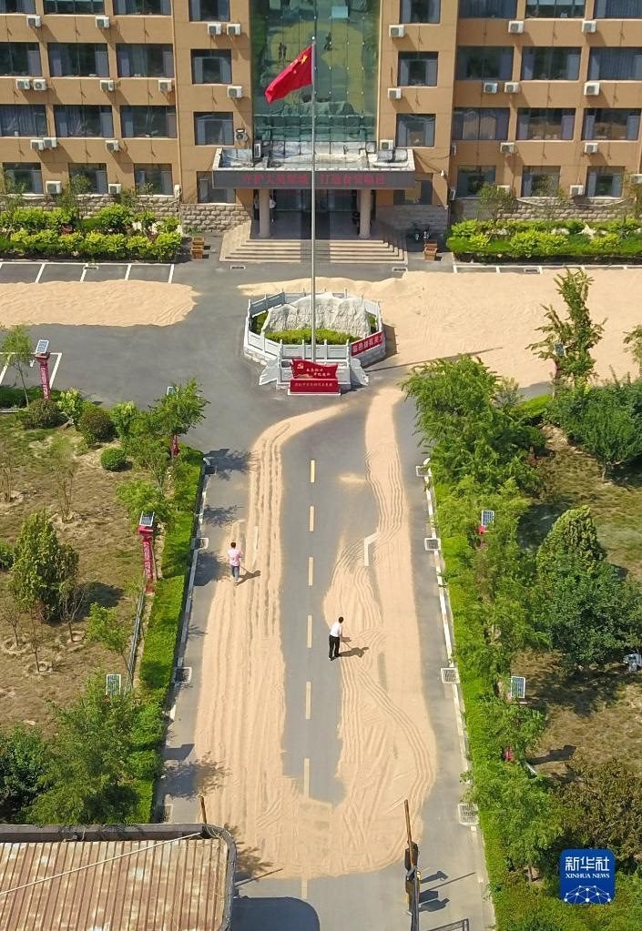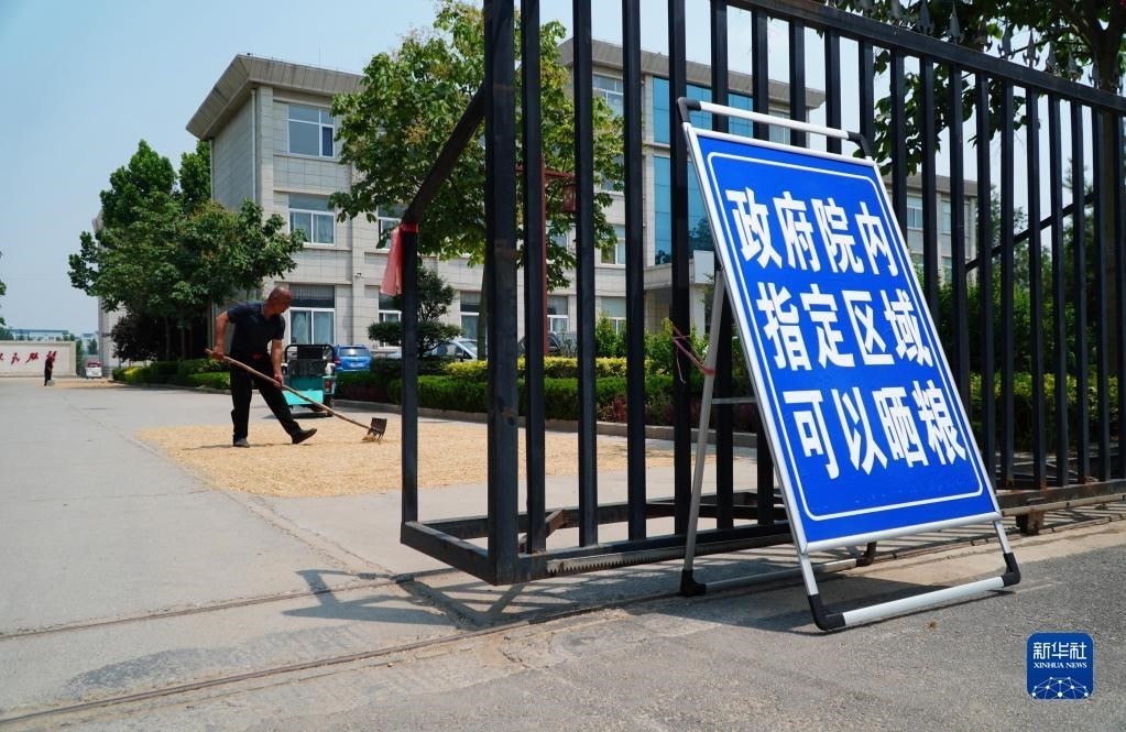 6月13日,農戶在臨邑縣臨盤街道政府大院曬糧。