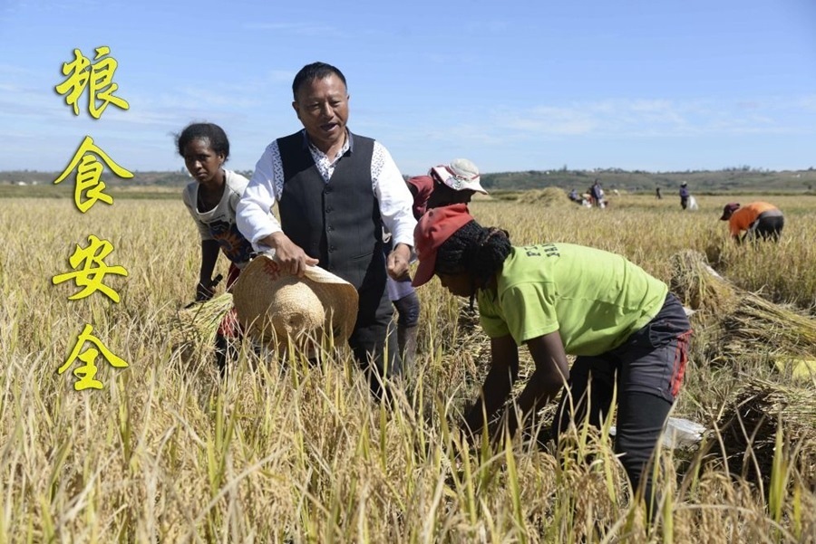 在馬達(dá)加斯加首都塔那那利佛附近的馬義奇鎮(zhèn),中國雜交水稻技術(shù)專家胡月舫(左二)在中國國家雜交水稻工程技術(shù)研究中心非洲分中心的試驗(yàn)田里和當(dāng)?shù)剞r(nóng)民交流(2023年5月12日攝)。目前,中國雜交水稻在馬達(dá)加斯加累計推廣面積已達(dá)5萬多公頃,平均每公頃產(chǎn)量可達(dá)7.5噸左右。馬達(dá)加斯加距離實(shí)現(xiàn)糧食自給自足的目標(biāo)邁近了一大步。