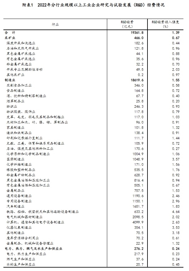 分產(chǎn)業(yè)部門(mén)看,高技術(shù)制造業(yè)研究與試驗(yàn)發(fā)展(R&D)經(jīng)費(fèi)6507.7億元,投入強(qiáng)度(與營(yíng)業(yè)收入之比)為2.91%,比上年提高0.20個(gè)百分點(diǎn)。在規(guī)模以上工業(yè)企業(yè)中,研究與試驗(yàn)發(fā)展(R&D)經(jīng)費(fèi)投入超過(guò)千億元的行業(yè)大類(lèi)有7個(gè),比上年增加2個(gè),這7個(gè)行業(yè)的經(jīng)費(fèi)占全部規(guī)模以上工業(yè)企業(yè)研究與試驗(yàn)發(fā)展(R&D)經(jīng)費(fèi)的比重為63.2%(詳見(jiàn)附表1)。