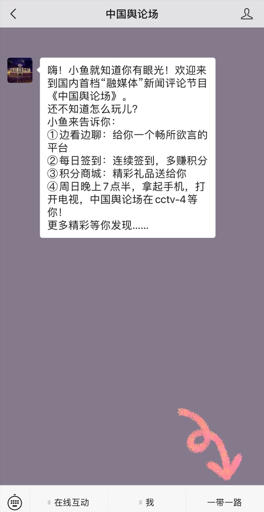 掃描下方二維碼,關注《中國輿論場》微信公眾號,給我們留言;點擊【一帶一路】,進入征集令頁面發(fā)送留言;點擊下方閱讀原文留言;如果您有圖片或視頻展示也可以直接發(fā)送到我們的郵箱(cctv4zgylc@163.com)參與征集活動。被選中的留言、圖片和視頻將有機會在《中國輿論場》全媒體平臺上展示。