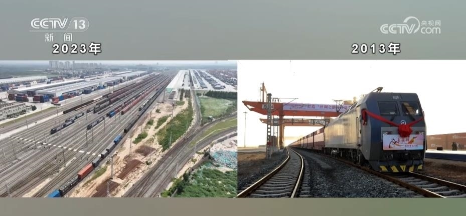 幾百輛剛出廠的新能源汽車(chē)整齊地排列在站臺(tái)上陸續(xù)裝箱,馬上它們將乘坐中歐班列“長(zhǎng)安號(hào)”前往中亞。2023年是“一帶一路”倡議提出10周年,也是中歐班列“長(zhǎng)安號(hào)”開(kāi)行10周年。每天都有數(shù)以億計(jì)的貨物在這里集散。