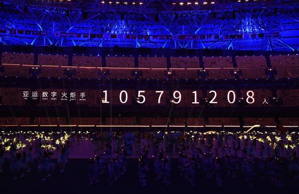 這是9月23日拍攝的開幕式現(xiàn)場(chǎng)顯示的亞運(yùn)數(shù)字火炬手人數(shù)。新華社記者黃宗治攝