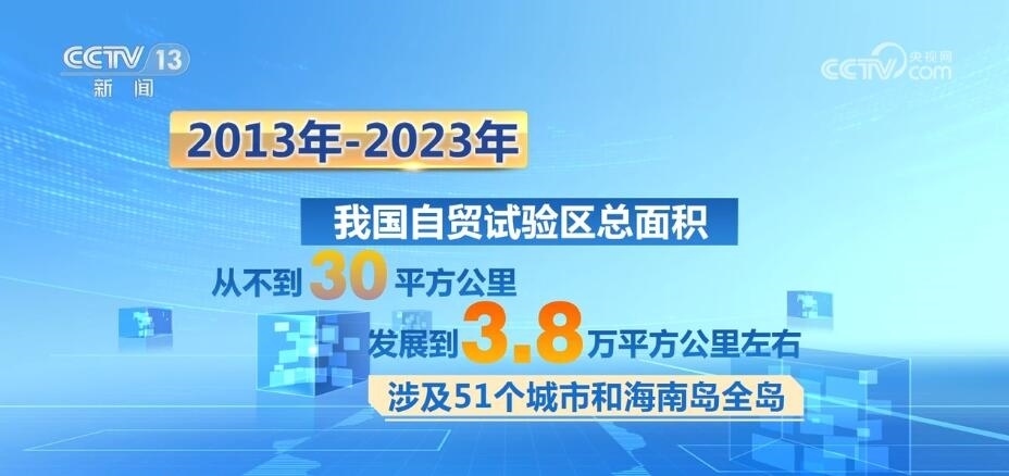 十年間,我國自貿(mào)試驗(yàn)區(qū)的總面積從不到30平方公里發(fā)展到3.8萬平方公里左右,涉及51個城市和海南島全島。今年上半年,我國自貿(mào)試驗(yàn)區(qū)以不到千分之四的國土面積,實(shí)現(xiàn)了占全國18.4%的外商投資和18.6%的進(jìn)出口總額,帶動全國形成了覆蓋東西南北中、統(tǒng)籌沿海內(nèi)陸沿邊的改革開放創(chuàng)新格局。