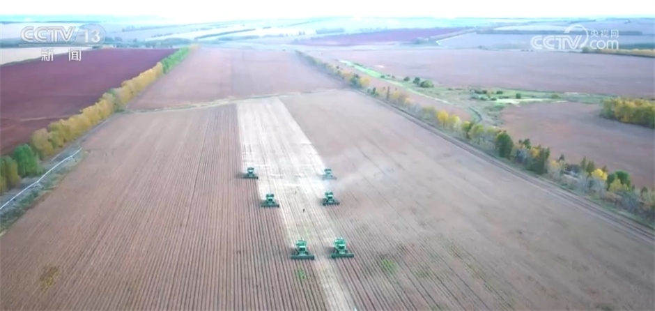 您現(xiàn)在看到的是黑龍江墾區(qū)鶴山農(nóng)場(chǎng)的大豆“高產(chǎn)攻關(guān)”示范田,眼下正是大豆收獲的高產(chǎn)期,農(nóng)場(chǎng)每天出動(dòng)52臺(tái)收獲機(jī),節(jié)糧減損,確保豐收的糧食顆粒歸倉(cāng)。