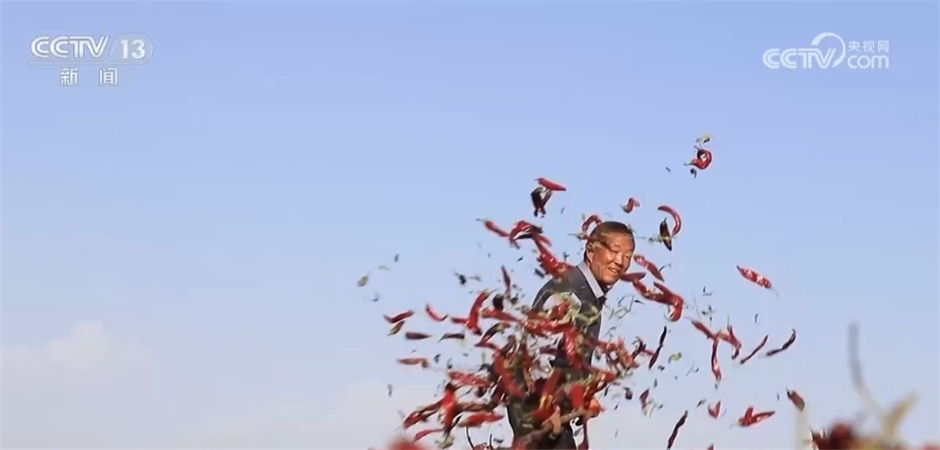 跟隨鏡頭,我們來(lái)到了新疆巴州和碩縣廣袤的戈壁灘上。眼下,50多萬(wàn)畝紅辣椒進(jìn)入全面采收晾曬季,放眼望去,一片片“紅色地毯”散發(fā)著熱辣的氣息。遍地的紅辣椒被有序鋪開(kāi),村民們穿梭其中,透著豐收的喜悅。當(dāng)?shù)剞r(nóng)業(yè)部門測(cè)算,今年當(dāng)?shù)乩苯樊a(chǎn)量可達(dá)140萬(wàn)噸以上,辣椒采收及晾曬工作將持續(xù)至11月前后。