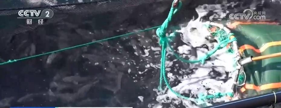 在煙臺(tái)長島南隍城海域,隨著經(jīng)海系列深水網(wǎng)箱里魚類的成熟,一場在大海上的收獲正在進(jìn)行。起降機(jī)將一個(gè)個(gè)裝滿魚兒的巨大網(wǎng)兜轉(zhuǎn)移到運(yùn)輸船上,2.5萬尾近4萬斤的成品黑鲪魚,將從這里銷往全國各地。