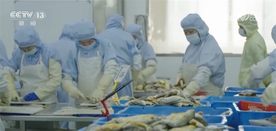 總臺央視記者 馬寧:我現(xiàn)在來到了寧德市當(dāng)?shù)匾患冶容^大的黃魚生產(chǎn)企業(yè),大家可以看到我身后就是工人們正在把已經(jīng)腌制好的黃魚經(jīng)過分撿、稱重、打包、送進(jìn)冷庫,這些經(jīng)過處理的大黃魚就可以通過冷鏈物流送到千家萬戶的餐桌上。