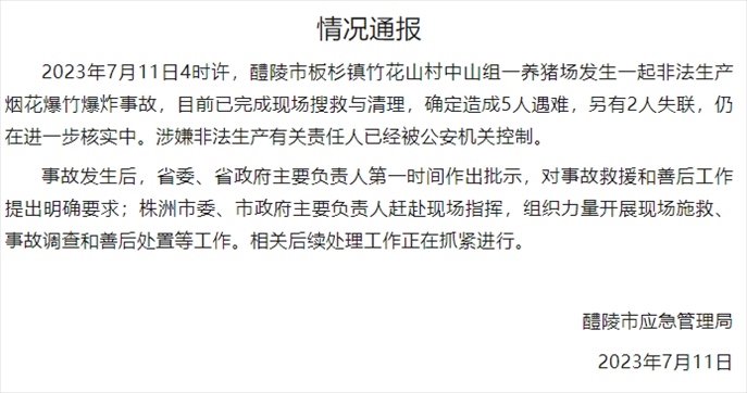 ·11日,湖南醴陵發(fā)生一起非法生產(chǎn)煙花爆竹爆炸事故,造成5人遇難,2人失聯(lián),涉嫌非法生產(chǎn)有關責任人已被公安機關控制,案件仍在進一步核實中。