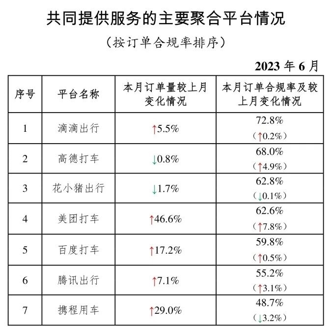 其中,面向乘客、與網(wǎng)約車平臺公司共同提供服務的平臺(俗稱“聚合平臺”)完成2.18億單,環(huán)比上升4.0%。按訂單合規(guī)率由高到低的分別是滴滴出行、高德打車、花小豬出行、美團打車、百度打車、騰訊出行、攜程用車。
