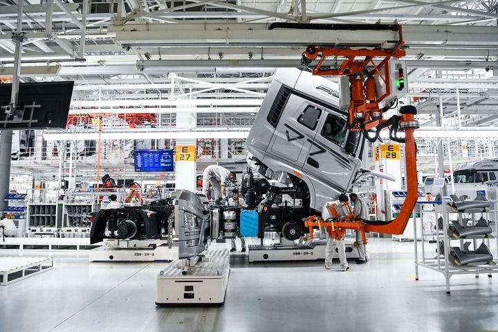 在位于吉林長(zhǎng)春的一汽解放汽車(chē)有限公司J7智能工廠內(nèi),工人在AGV(搬運(yùn)機(jī)器人)上裝配車(chē)輛(2023年6月12日攝)。新華社記者 顏麟蘊(yùn) 攝