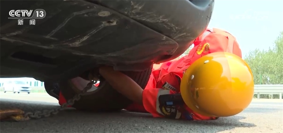 兩人將鐵鏈和拖車鉤工具套在故障車前底盤,但這得鉆進(jìn)車底,貼地操作。中午的高速柏油路面氣溫已經(jīng)逼近60℃,發(fā)燙的路面和陣陣熱浪讓人滿身灼熱感。隨后,兩人通過卷揚機將故障車牽引到救援車上,再逐一固定好故障車的四個輪胎。高溫下在高速露天作業(yè),他倆的頭發(fā)上不斷甩出汗珠。