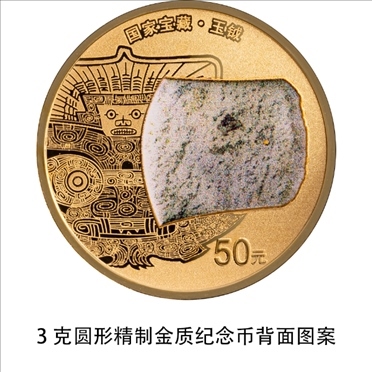 3克圓形金質(zhì)紀念幣背面圖案為玉鉞造型,襯以良渚文化相關(guān)紋飾,并刊“國家寶藏·玉鉞”字樣及面額。