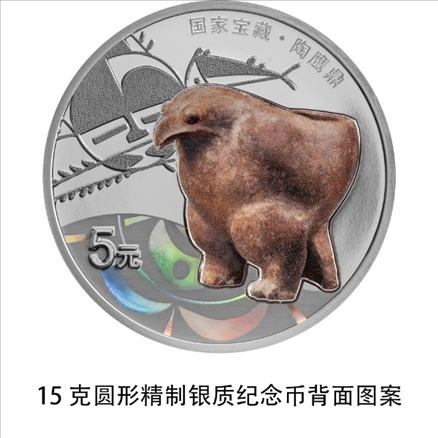 15克圓形銀質(zhì)紀念幣背面圖案為陶鷹鼎造型,襯以仰韶文化相關(guān)紋飾,并刊“國家寶藏·陶鷹鼎”字樣及面額。