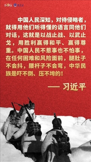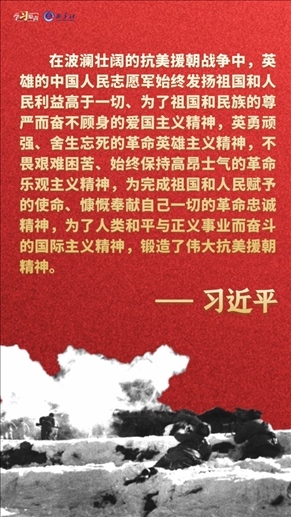 偉大抗美援朝精神跨越時空、歷久彌新。我們要銘記抗美援朝戰(zhàn)爭的艱辛歷程和偉大勝利,敢于斗爭、善于斗爭,知難而進(jìn)、堅韌向前,把新時代中國特色社會主義偉大事業(yè)不斷推向前進(jìn)。