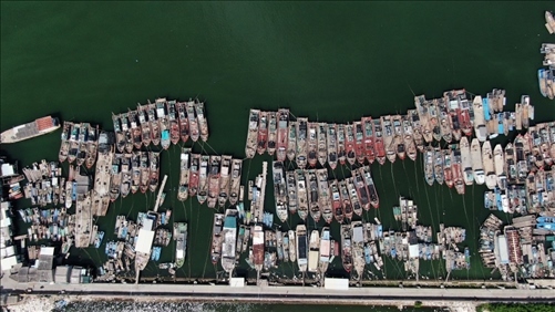 7月27日,廣東省潮州市饒平縣三百門漁港里回港避風的漁船(無人機照片)。 新華社記者王瑞平攝