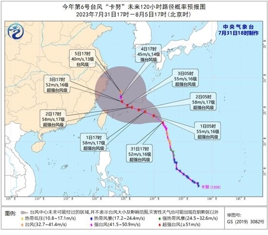 8月1日開始,受副熱帶高壓變弱、形態(tài)改變的影響,“卡努”的引導氣流將變得不太清晰,其移速也將減緩。最新預報顯示,“卡努”將以每小時15-20公里的速度向西北方向移動,強度還將有所增強,8月2日夜間移入東海,逐漸轉向偏北方向移動,移速明顯減慢。
