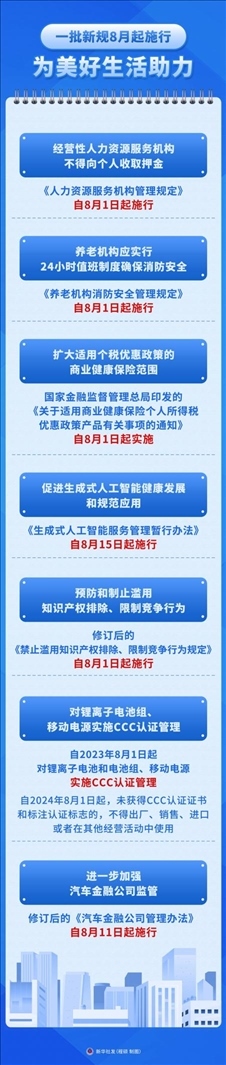 ·一批民生新規(guī)8月開始施行。從完善人力資源服務(wù)機(jī)構(gòu)管理,到強(qiáng)化養(yǎng)老機(jī)構(gòu)消防安全;從擴(kuò)大適用個(gè)稅優(yōu)惠政策的商業(yè)健康保險(xiǎn)范圍,到規(guī)范生成式人工智能服務(wù)……法治,為美好生活助力。
