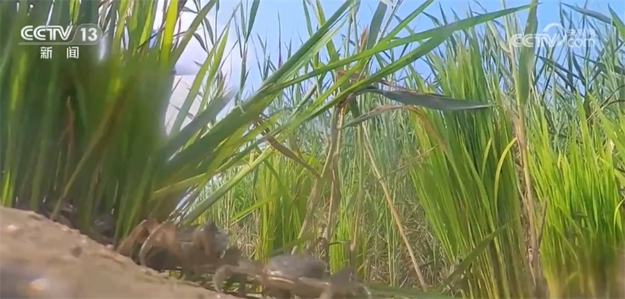 除了這群開心干活的鴨子,記者在稻田里還看到了螃蟹的身影,王千士說,起初稻田里最先養(yǎng)的是螃蟹,他想著利用螃蟹吃草吃蟲。可事與愿違,放進(jìn)稻田的螃蟹犯了懶,躲進(jìn)水里不干活,原來是螃蟹在邊溝里待著太舒服。第二年,王千士根據(jù)專家建議把溝挖深,同步養(yǎng)起了魚,螃蟹為了防止魚傷害自己,一個(gè)個(gè)從邊溝爬出來,進(jìn)入稻田之中。