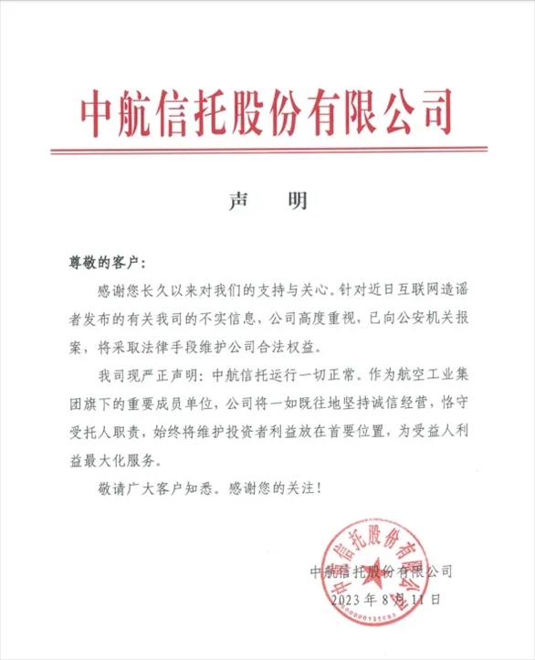中航信托股份有限公司(下稱“中航信托”)在微信官方公眾號(hào)發(fā)文回應(yīng)稱,“針對(duì)近日互聯(lián)網(wǎng)造謠者發(fā)布的有關(guān)我司的不實(shí)信息,公司高度重視,已向公安機(jī)關(guān)報(bào)案,將采取法律手段維護(hù)公司合法權(quán)益。我司現(xiàn)嚴(yán)正聲明:中航信托運(yùn)行一切正常。作為航空工業(yè)集團(tuán)旗下的重要成員單位,公司將一如既往地堅(jiān)持誠(chéng)信經(jīng)營(yíng),恪守受托人職責(zé),始終將維護(hù)投資者利益放在首要位置,為受益人利益最大化服務(wù)?!?/p>