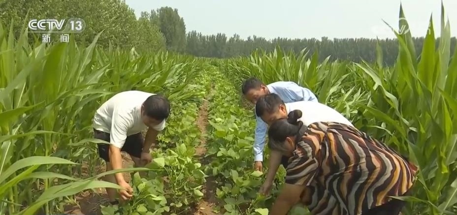 在內(nèi)黃縣石盤屯鄉(xiāng)牛林村的玉米大豆套種種植區(qū),玉米長勢挺拔、碩大飽滿。種植大戶徐改云正在田間采掰成熟的首茬鮮食玉米。