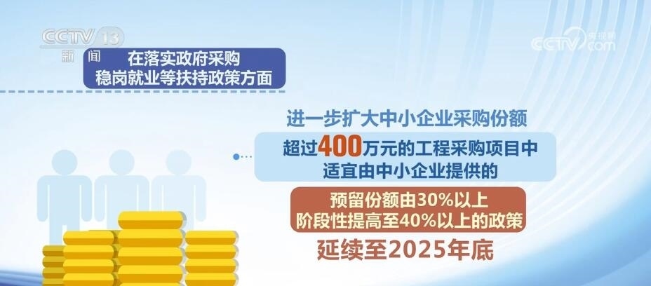 在落實政府采購、穩(wěn)崗就業(yè)等扶持政策方面,進一步擴大中小企業(yè)采購份額,超過400萬元的工程采購項目中適宜由中小企業(yè)提供的,預留份額由30%以上階段性提高至40%以上的政策延續(xù)至2025年底;中小微企業(yè)招用符合條件的畢業(yè)年度或離校2年內未就業(yè)高校畢業(yè)生、登記失業(yè)青年,簽訂1年以上勞動合同的,可按規(guī)定申請一次性吸納就業(yè)補貼;符合條件的中小微企業(yè)可按不超過企業(yè)及其職工上年度實際繳納失業(yè)保險費的60%申請失業(yè)保險穩(wěn)崗返還;對招用畢業(yè)年度和離校2年內未就業(yè)高校畢業(yè)生的小微企業(yè),按規(guī)定落實社會保險補貼政策。