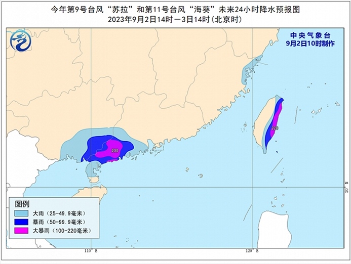 降水預(yù)報:9月2日14時至3日14時,受“蘇拉”和“??庇绊?,廣東西南部、廣西東南部、福建東北部沿海、臺灣島東部等地有大到暴雨,其中,廣東西南部、臺灣島東部等地部分地區(qū)有大暴雨(100~220毫米)。