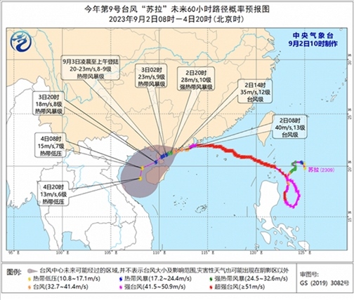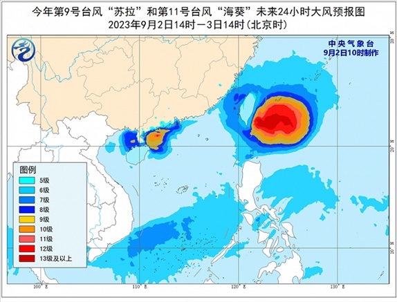 大風預(yù)報:9月2日14時至3日14時,受“蘇拉”影響,南海西北部、北部灣東部、瓊州海峽及廣東中西部沿海、廣西南部沿海、海南北部沿海、珠江口以及香港和澳門等地將有6-8級、陣風9-10級的大風,“蘇拉”中心經(jīng)過的附近海面或地區(qū)風力有11-12級、陣風13-14級;受“??庇绊懀_灣海峽、巴士海峽、浙江南部沿海、福建沿海、廣東東部沿海、臺灣島沿海將有6-8級,陣風9-10級大風,臺灣以東洋面部分海域風力可達9-12級,陣風13-14級,“海葵”中心經(jīng)過的附近海面風力可達13-16級,陣風17級及以上。