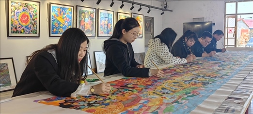 吉林省梨樹縣民間藝術家正在創(chuàng)作《關東七彩農民畫、心系亞運向未來》農民畫。受訪者供圖