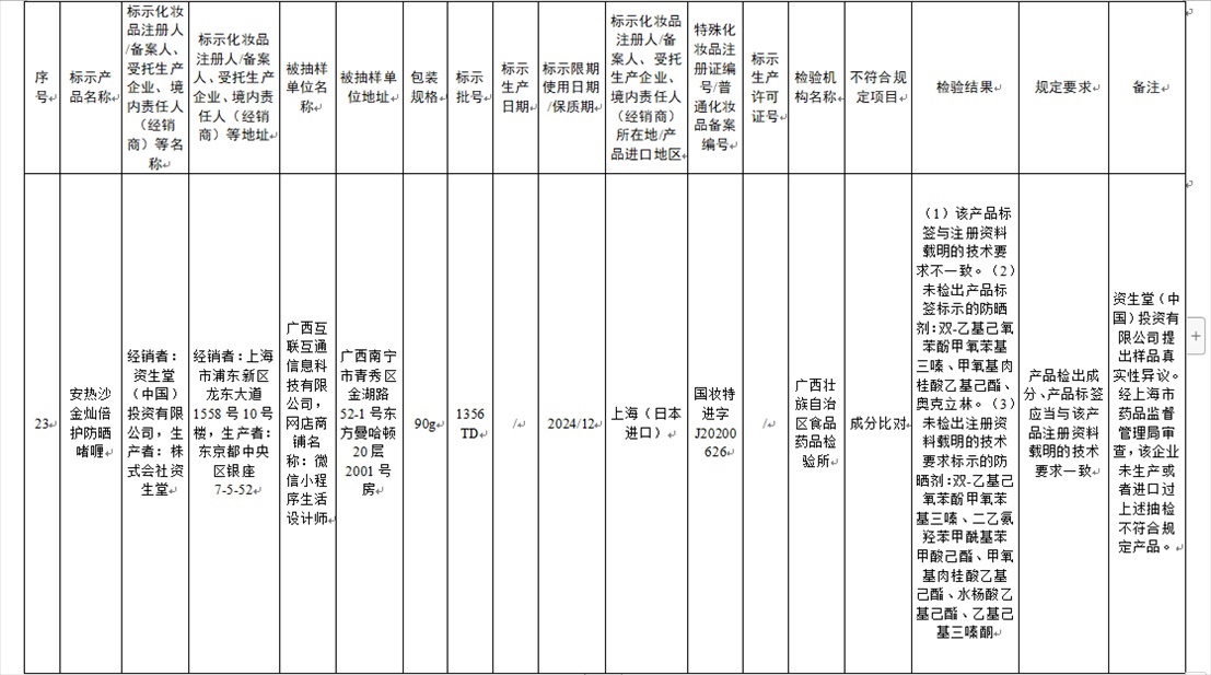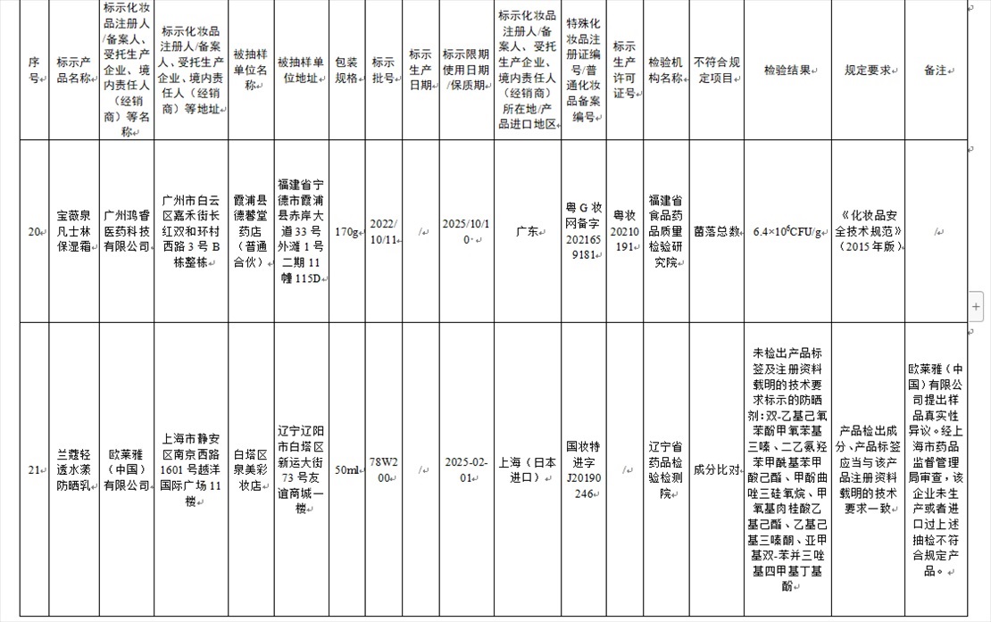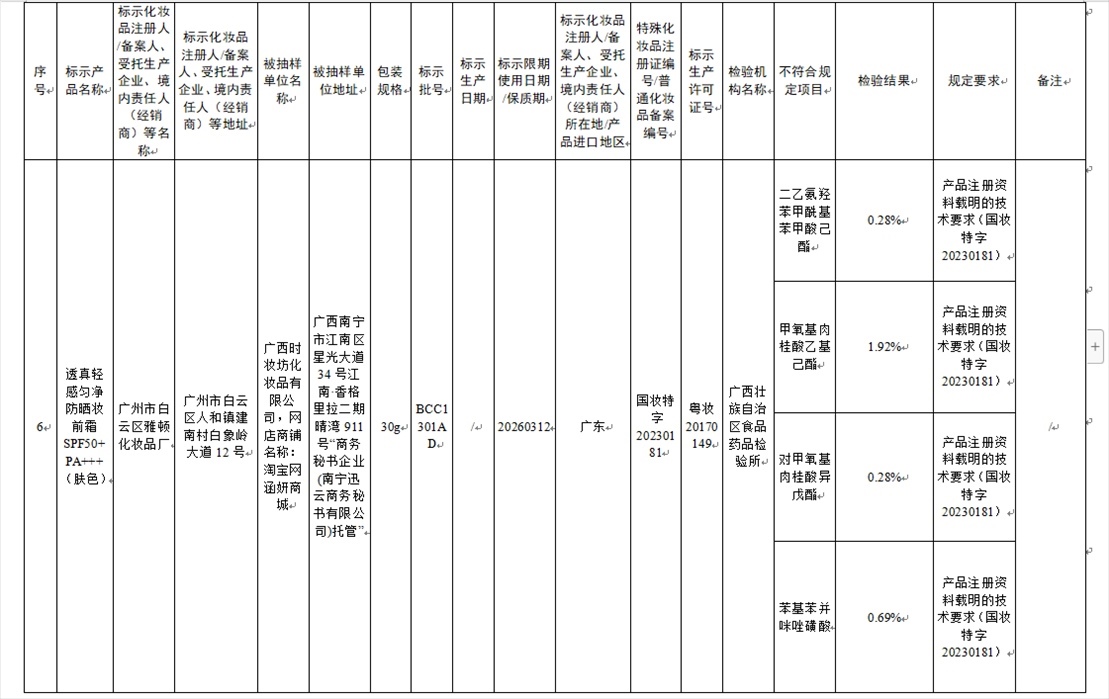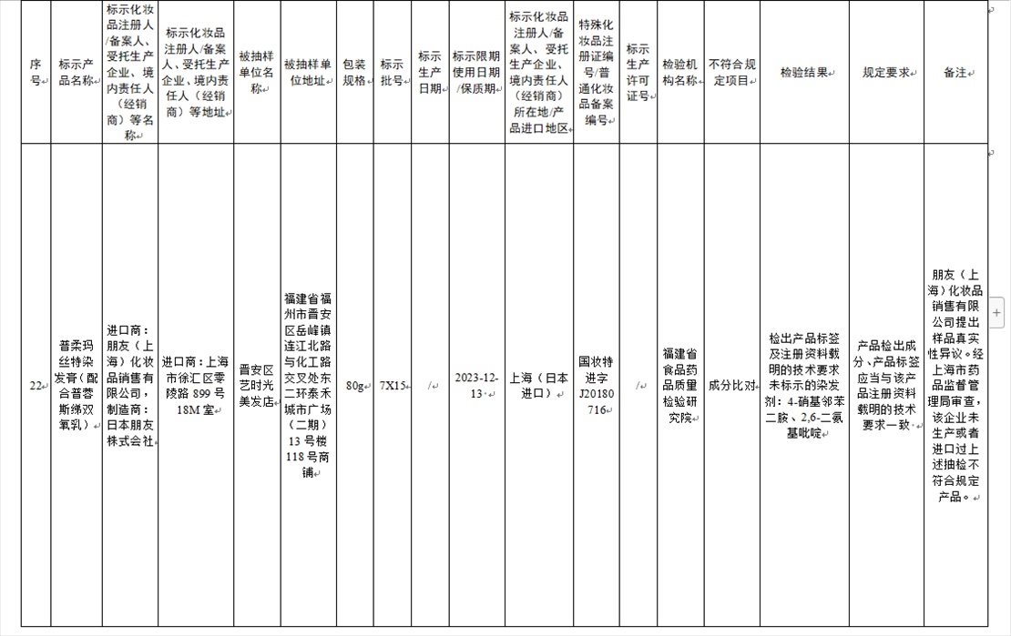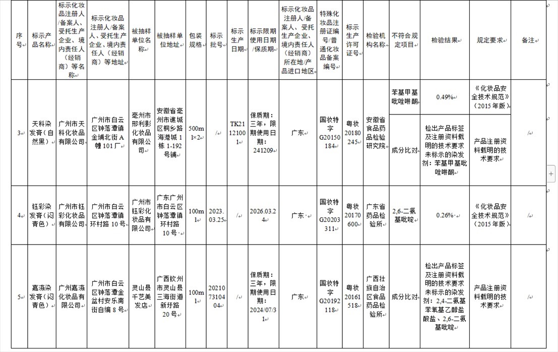 國家藥監(jiān)局網(wǎng)站今天發(fā)布通告稱,在2023年國家化妝品抽樣檢驗(yàn)工作中,經(jīng)重慶市食品藥品檢驗(yàn)檢測研究院等單位檢驗(yàn),產(chǎn)品標(biāo)簽標(biāo)示為廣州市天科化妝品有限公司生產(chǎn)的天科染發(fā)膏(自然黑)等23批次化妝品不符合規(guī)定(見下圖表格)。