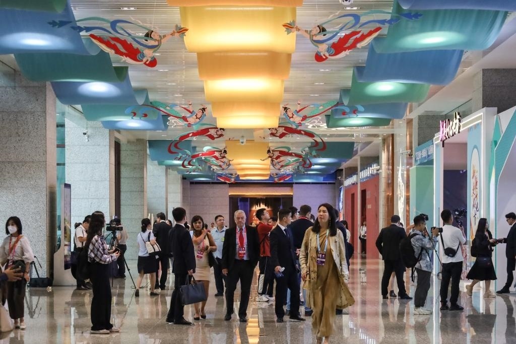 9月6日,與會嘉賓在第六屆絲綢之路(敦煌)國際文化博覽會上參觀。新華社記者 馬希平 攝