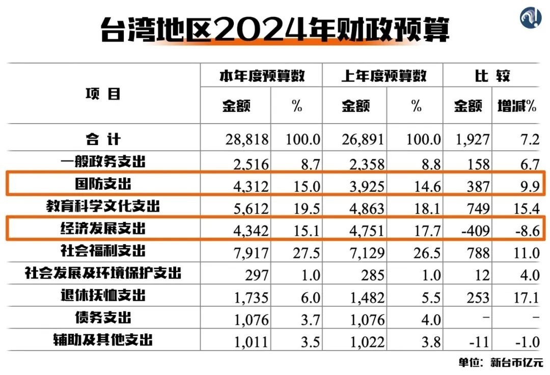 民進(jìn)黨當(dāng)局不久前通過的2024年財(cái)政預(yù)算案就很能說明問題。各項(xiàng)支出中,防務(wù)支出繼續(xù)保持增長,經(jīng)濟(jì)發(fā)展支出卻是所有領(lǐng)域中跌幅最大的。