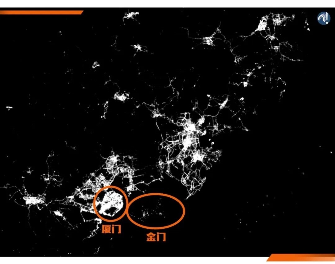 這是福建周邊的夜光遙感地圖??梢钥吹剑驮趶B門被點(diǎn)亮的時(shí)候,金門卻是一片漆黑。與此同時(shí),金門的發(fā)展也有個(gè)特點(diǎn),那就是靠近大陸的地方更亮。