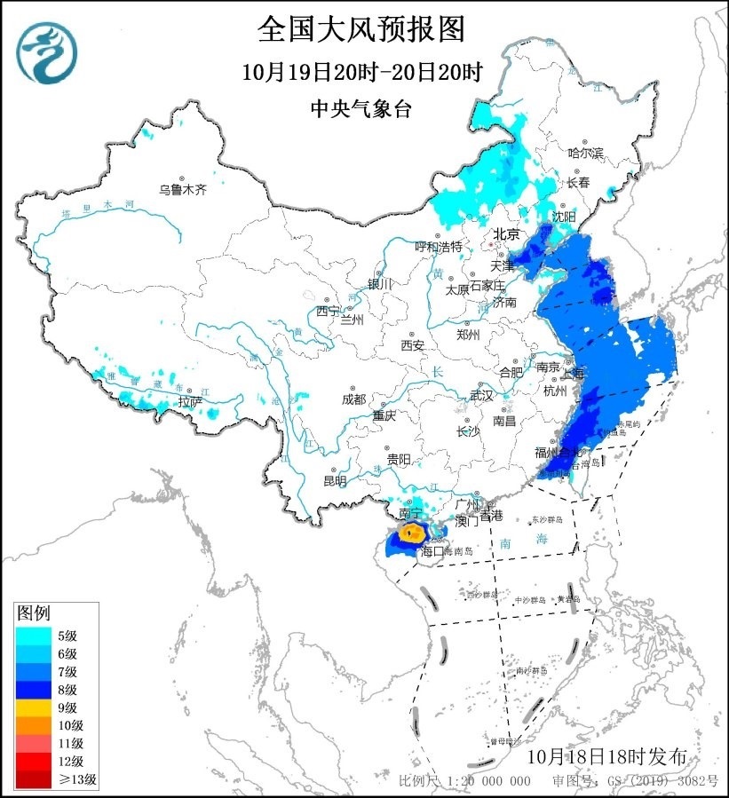 10月19日20時至20日20時,南海西北部海域、北部灣、瓊州海峽將有6~8級、陣風9級的大風,其中北部灣的部分海域風力可達9~10級,陣風11~12級。渤海、渤海海峽、黃海大部海域、東海大部海域、臺灣海峽將有7~8級、陣風9級的大風。內蒙古中東部、遼寧南部和西部、廣西南部沿海等地將有5~6級、陣風7~8級的大風。