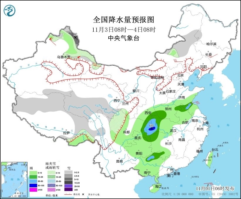 11月3日08時至4日08時,內(nèi)蒙古東部、新疆北部、西藏北部和東部、青海中南部、川西高原北部等地部分地區(qū)有小到中雪,其中,新疆阿勒泰地區(qū)等地部分地區(qū)有大到暴雪(10~12毫米);陜西南部、四川東部、重慶中東部、湖北西部、河南西部、安徽北部、江蘇北部、廣西北部等地部分地區(qū)有中到大雨,其中,湖北西部、重慶東北部等地部局地有暴雨(50~60毫米)。內(nèi)蒙古中西部、吉林中部、遼東半島、新疆北部等地部分地區(qū)有5~7級風(fēng),其中,新疆北部和東部部分地區(qū)有7~8級風(fēng),陣風(fēng)9級(見圖3)。