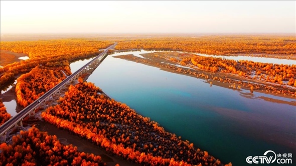 2023年10月30日,新疆阿克蘇地區(qū)沙雅縣境內(nèi),落日余暉下的哈德墩大橋、金色胡楊和塔里木河交相輝映,美不勝收。