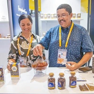 在食品及農(nóng)產(chǎn)品展區(qū),南非參展商展示當(dāng)?shù)靥禺a(chǎn)蜜樹茶。本報(bào)記者 張武軍攝