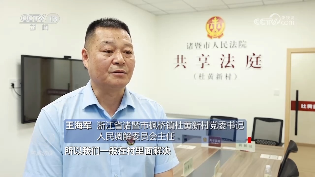 浙江省諸暨市楓橋鎮(zhèn)杜黃新村黨委書記、人民調(diào)解委員會主任王海軍:“村里一般的調(diào)解村兩委會以及村調(diào)委基本上就地解決,因為‘楓橋經(jīng)驗’矛盾不出村,所以我們一般在村里面解決。但是涉及到法律法規(guī)一塊或者有些老百姓在‘心結(jié)’上面解不開,我們就動用共享法庭?!?/p>