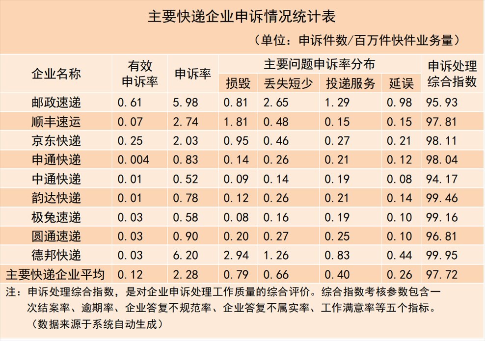 3.主要快遞企業(yè)申訴情況。主要快遞企業(yè)申訴率(百萬件快件業(yè)務量)平均為2.28,有效申訴率平均為0.12。用戶對快遞服務申訴主要問題中,快件損毀申訴率平均為0.79,快件丟失短少申訴率平均為0.66,投遞服務申訴率平均為0.40,快件延誤申訴率平均為0.26;主要快遞企業(yè)申訴處理綜合指數(shù)平均為97.72,高于平均值的有6家,低于平均值的有3家。