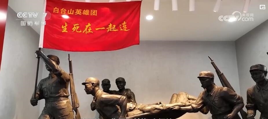 軍事記者 張喬普:在這個旅的旅史長廊,在我身旁的這些櫥窗,我看到了包括“生死在一起”連在內(nèi)的,一共17個英模單位的旗幟。這一面面鮮紅的戰(zhàn)旗,見證、記錄了這個旅代代官兵一路從抗日戰(zhàn)爭時期到抗美援朝浴血奮戰(zhàn)、英勇無畏的戰(zhàn)斗足跡。其中最引人注目的就是我身旁的這面“白臺山英雄團”的戰(zhàn)旗。這面戰(zhàn)旗曾參加國慶70周年閱兵,在天安門廣場接受黨和人民的檢閱。而她的精神內(nèi)核,就是“生死在一起”。