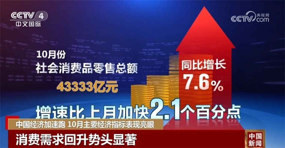 央視網(wǎng)消息:來關(guān)注中國經(jīng)濟(jì)10月報(bào)。國家統(tǒng)計(jì)局昨天(11月15日)發(fā)布了10月份經(jīng)濟(jì)主要指標(biāo)。數(shù)據(jù)顯示,隨著宏觀調(diào)控政策持續(xù)發(fā)力顯效,全國生產(chǎn)供給穩(wěn)中有升,市場需求持續(xù)改善,就業(yè)物價總體穩(wěn)定,高質(zhì)量發(fā)展扎實(shí)推進(jìn),國民經(jīng)濟(jì)持續(xù)恢復(fù)向好。
