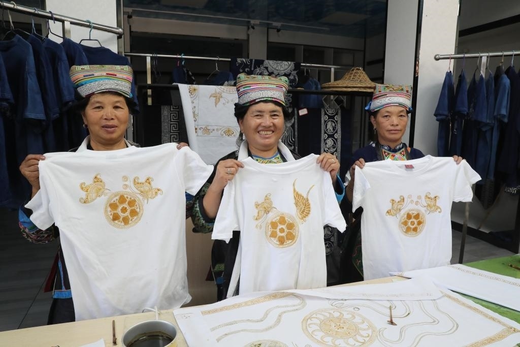9月1日,苗族婦女姜老本(中)展示她和村民用蠟筆在T恤上畫的“村超”足球。(李長(zhǎng)華 攝)