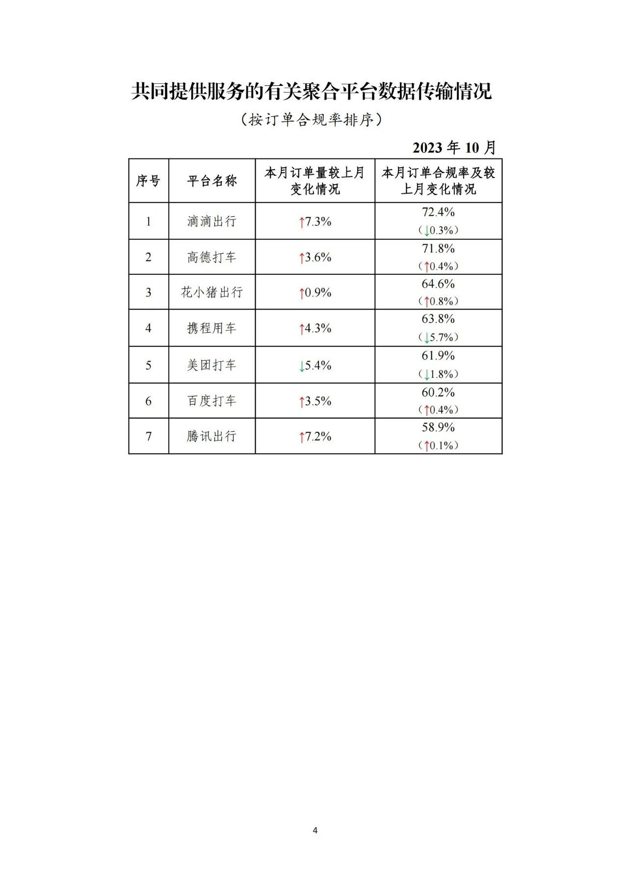 其中,面向乘客、與網(wǎng)約車(chē)平臺(tái)公司共同提供服務(wù)的平臺(tái)(俗稱(chēng)“聚合平臺(tái)”)完成2.23億單,環(huán)比上升3.6%。按訂單合規(guī)率由高到低的分別是滴滴出行、高德打車(chē)、花小豬出行、攜程用車(chē)、美團(tuán)打車(chē)、百度打車(chē)、騰訊出行。