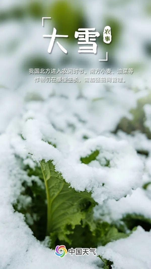 大雪時節(jié),我國北方地區(qū)冰天雪地,進(jìn)入農(nóng)閑時節(jié)。而南方小麥、油菜等作物仍在緩慢生長,需要加強(qiáng)田間管理。一旦遭受凍害,要及時松土增肥、蓄水提溫、加強(qiáng)中后期管理,力爭把凍害損失降到最低。
