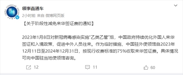 ·外交部領(lǐng)事保護(hù)中心:階段性減免來(lái)華簽證費(fèi)。